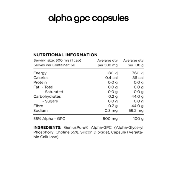 GeniusPure® Alpha-GPC (Alpha-Glyceryl Phosphoryl Choline 55%), Silicon Dioxide, Capsule (Vegetable Cellulose).